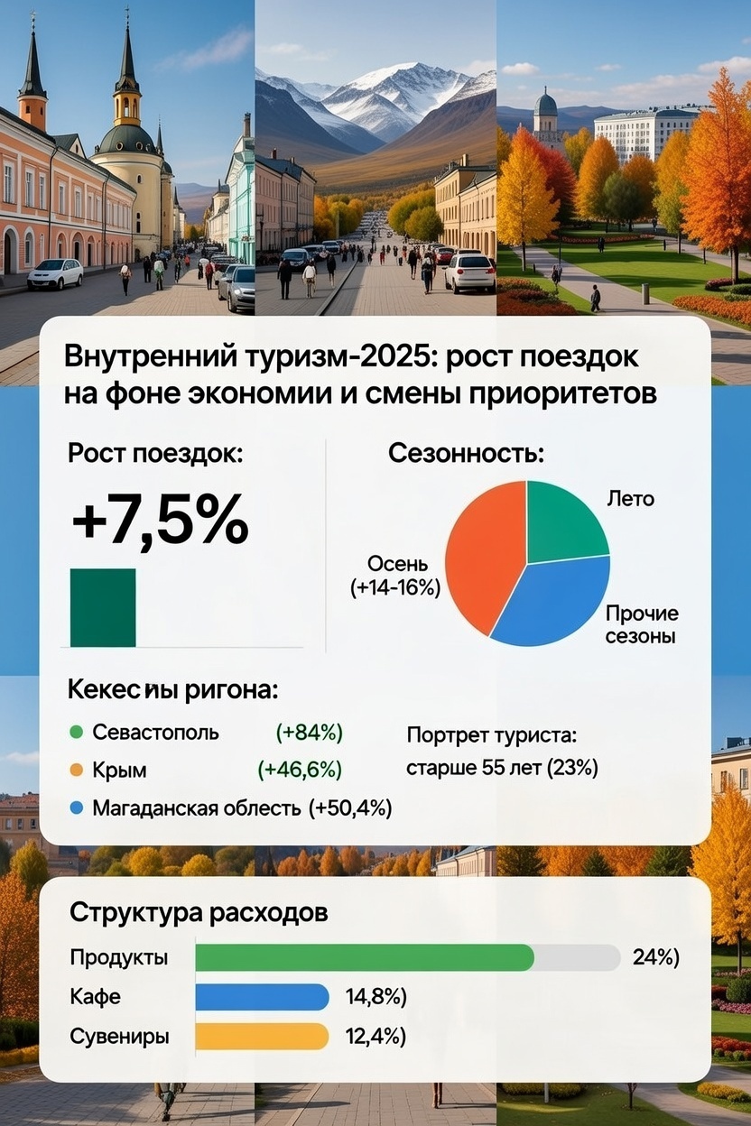 Итоговый вывод: Российский внутренний туризм в 2025 году стал более зрелым и прагматичным. Рост поездок сопровождается сглаживанием сезонности и перераспределением потоков, часто под влиянием внешних факторов (экология). Несмотря на рост номинальных доходов, туристы склонны к рациональному планированию бюджета, предпочитая экономить на ежедневном питании, но тратясь на впечатления и сувениры. Главным драйвером является не столько рост благосостояния, сколько изменение привычек: зрелая аудитория ищет комфорт и культуру, а цифровые инструменты становятся обязательным элементом любого путешествия.